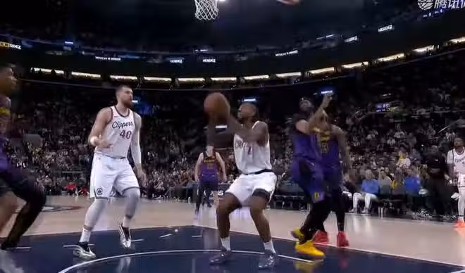 隨後濃眉好不容易傳了一個好球給到籃下的詹姆斯上空籃兒,此時就出現了這個鏡頭,鮑威爾他們看著詹皇,覺得這球不再犯規了,再碰他一下那就白送2+1,所以也不上去了,結果萬萬沒有想到勒布朗硬生生的空籃還是不中。