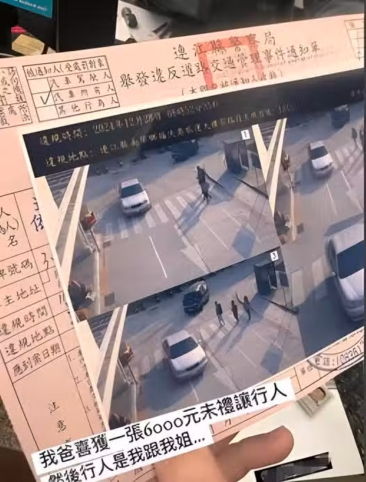 根據網友分享的照片,當時他父親開車行經斑馬線,起初距離行人約有4個枕木紋,但車輛駛離斑馬線時,距離行人僅剩2個枕木紋,因此警方仍可依法取締。