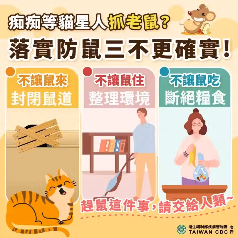 衛生局表示,全台近三年來漢他病毒症候群確診數分別為5例、6例及3例,而台北市分別為1例、2例及0例,最好的預防方法是防鼠,勿接觸到鼠類及其排泄物與分泌物,呼籲民眾應落實居家防鼠3不策略:「不讓鼠來-封閉鼠道、不讓鼠住-整理環境、不讓鼠吃-斷絕糧食。」