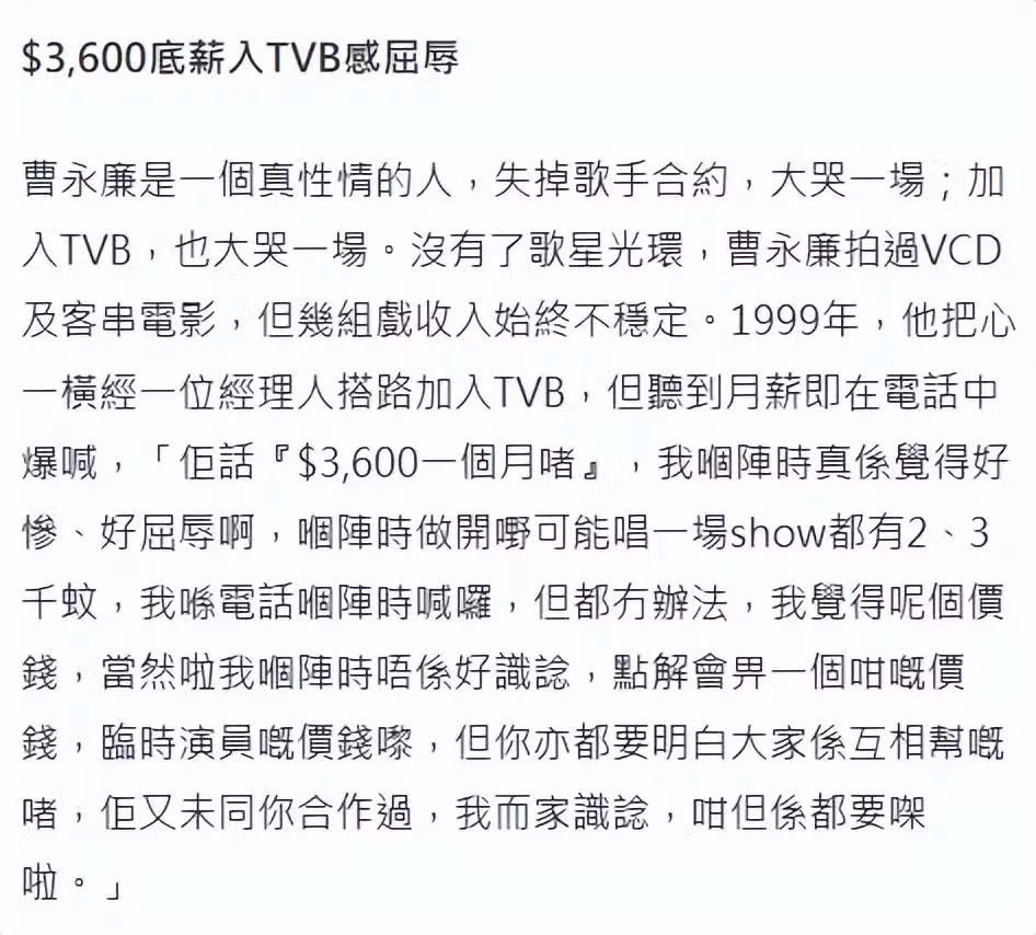 當時曹永廉身無分文,三十多歲還有十多萬的外債,每日以淚洗面,最終決定去TVB拍戲,但聽到工資只有3600港幣的時候,曹永廉大哭一場。