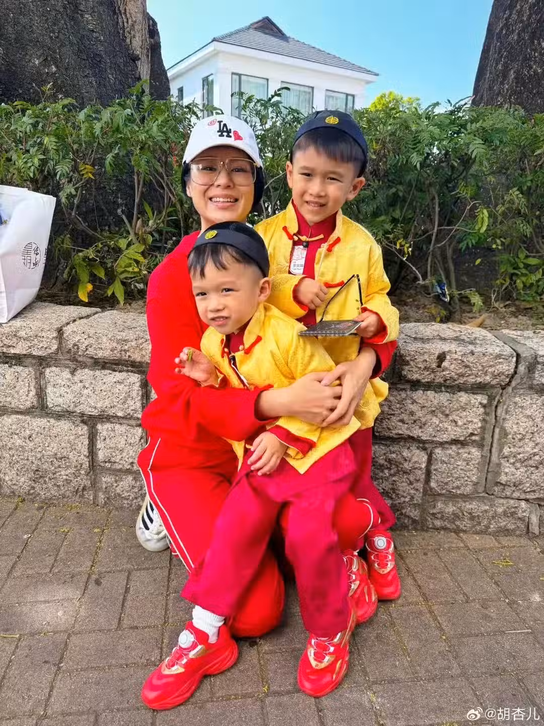 胡杏兒一家五口迎新年,三個兒子穿唐裝帥氣可愛,模樣似複製粘貼
