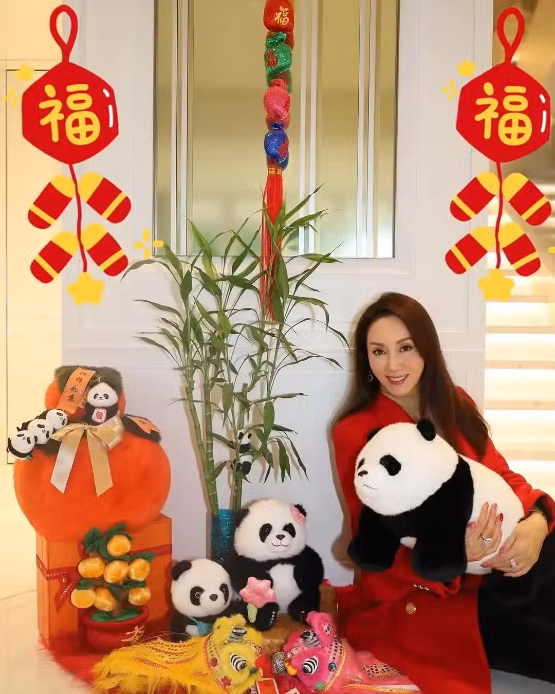 郭可盈把帶回來的大熊貓玩偶擺放在家中豪宅,增添節日氛圍感。郭可盈抱著大熊貓愛不釋手,還跟大熊貓「一家三口」來了個五連拍,簡直超可愛。