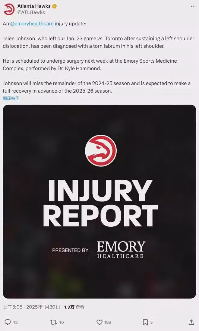 1月30日,老鷹官方宣布:杰倫-詹森遭遇左肩盂唇嚴重撕裂,將在下周接受手術,本賽季確定報銷!更扎心的是,老鷹2025年的首輪簽在馬刺手裡,而且是無保護。如果老鷹接下來擺爛,馬刺能得到一個高順位首輪簽。