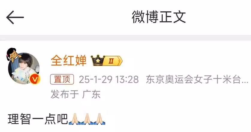 大家都處於過年的歡樂當中,但沒想到的是,作為巴黎奧運會雙冠王的全紅嬋,在大年初一的中午時分,發布了一條讓人很意外的信息,她在自己的社交媒體上奉勸網友「理智一點吧!」!