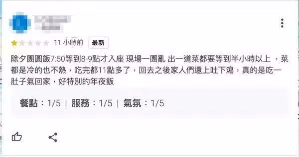 另外還有消費者留言「菜都是冷的也不熱,吃完都11點多了,回去之後家人們還上吐下瀉」、「每道菜間隔半小時以上 順序也錯亂 吃完都11點了…回去之後家人還上吐下瀉 爛。」