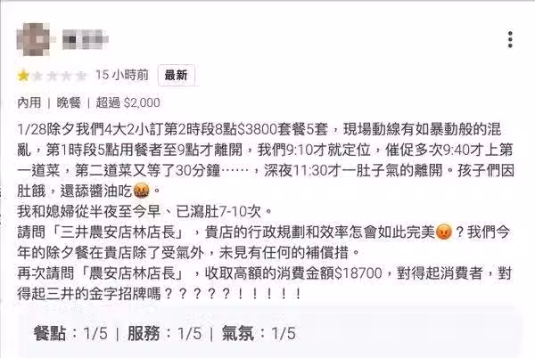 三井日式料理出事了!吃完年夜飯「上吐下瀉」慘遭一星負評洗版衛,生局要查了!