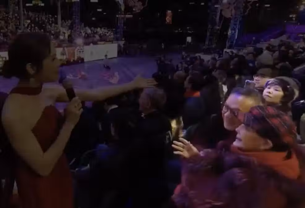 在白韻琴旁邊的是謝偉俊,在鏡頭中,他一直小心呵護著白韻琴,不時地在她耳邊竊竊私語,應該是在為白韻琴解釋、說明現場發生的一切。謝偉俊的細心程度展現出了夫妻之間的恩愛,不過也讓他看起來更像是白韻琴的兒子而非丈夫。