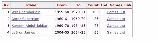 那麼排在詹姆斯之前的球員都是誰呢?分別是:張伯倫(103次)、羅伯特森(83次)、賈巴爾(78次)。字母哥可能無法去挑戰張伯倫的103次紀錄,不過羅伯特森的83次紀錄字母哥有希望去挑戰。