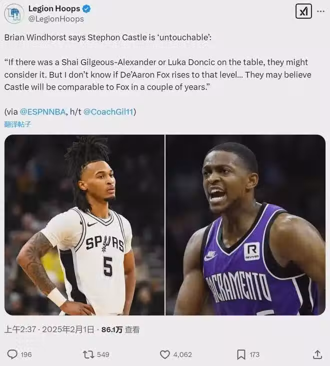卡斯爾是馬刺非常看重的潛力股,馬刺管理層認為,卡斯爾再過幾年也能達到福克斯的高度,所以不肯把他放進交易當中。NBA官方最新一期的新秀榜,卡斯爾高居第一,灰熊39號秀杰倫-韋爾斯排名第二,奇才榜眼薩爾跌至第三。