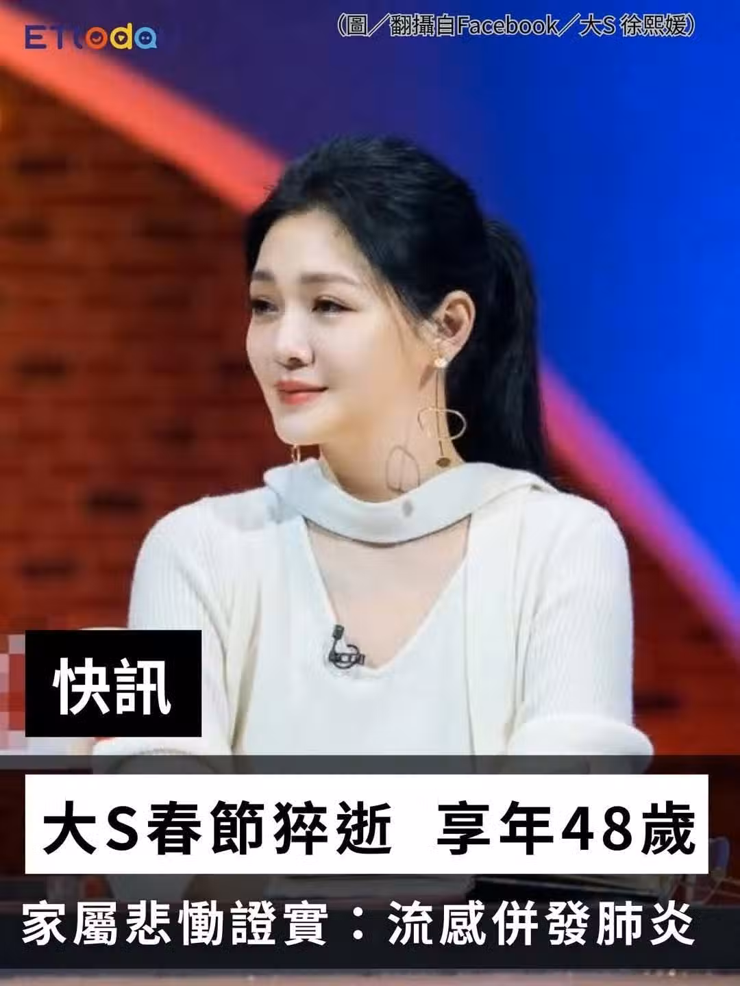 網絡2日瘋傳有台灣女星在日本因流感猝逝,線索紛紛指向大S,小S稍早發聲明悲痛證實,大S於春節期間赴日本旅遊,因染上流感並發肺炎,不幸過世,享年48歲,小S難過說:「感恩這輩子能成為她的姊妹,彼此照顧、相伴,我會永遠感激她、懷念她!」