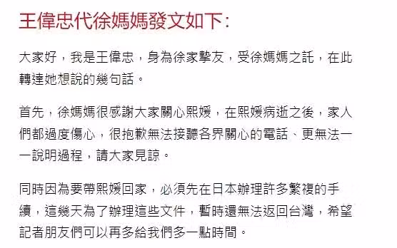 首先,徐媽媽非常感謝大家對熙媛的關心,在熙媛病逝之後,家人們都過度傷心,很抱歉無法正常接聽各界關心的電話與信息,無法說明過程,請大家見諒。