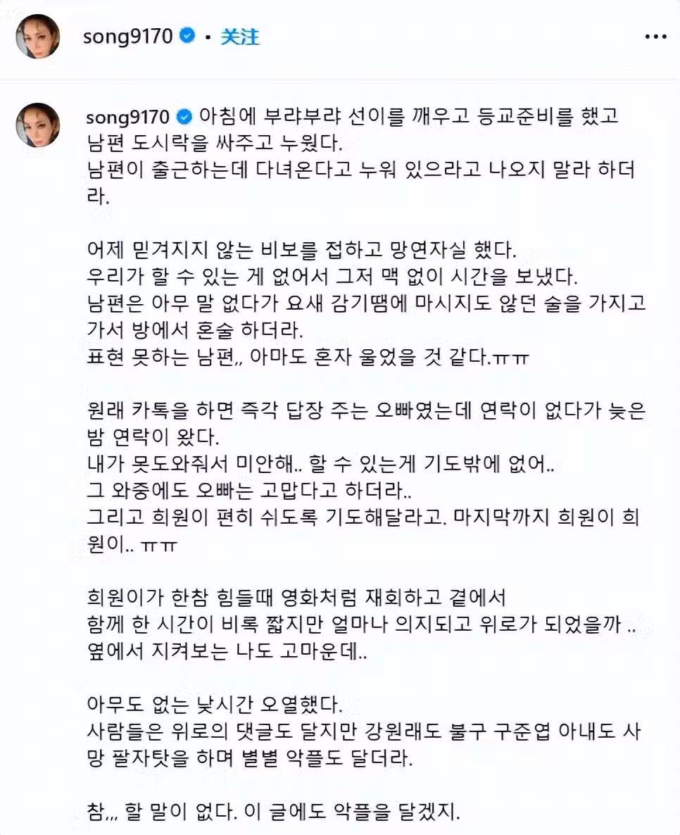 目前,具俊曄僅接受韓媒採訪回應「不太好」,好友金松發文表示,3日深夜收到具俊曄的回覆,他希望金松為大S祈福,然後嘴裡不停喊著「熙媛」,滿腦子都是大S。