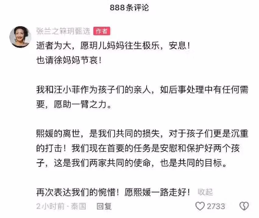的前婆婆張蘭也發聲悼念,雖然雙方彼此有矛盾,但在重要關頭,張蘭選擇放下之前恩怨,仍稱大S為家人。