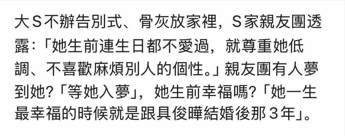 徐家親友認為,這樣的安排是尊重大S,她平時連生日都不想過,相信也不會想要辦告別式。