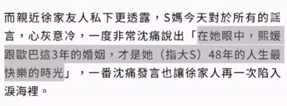 2月7日,S媽黃春梅稱女兒徐熙媛嫁給具俊曄的3年,是她48年之中最幸福的3年。