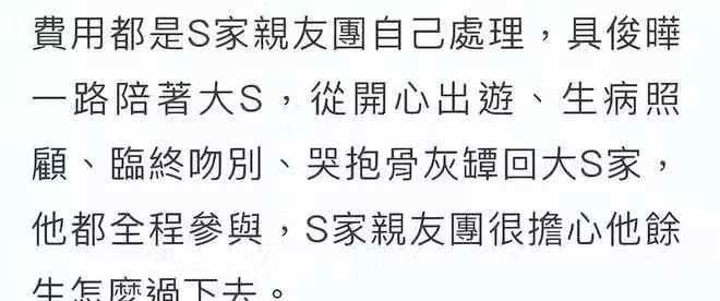 而具俊曄對大S情之深愛之切,直言只想要大S,不在意遺產,願意把遺產都轉贈徐媽媽。