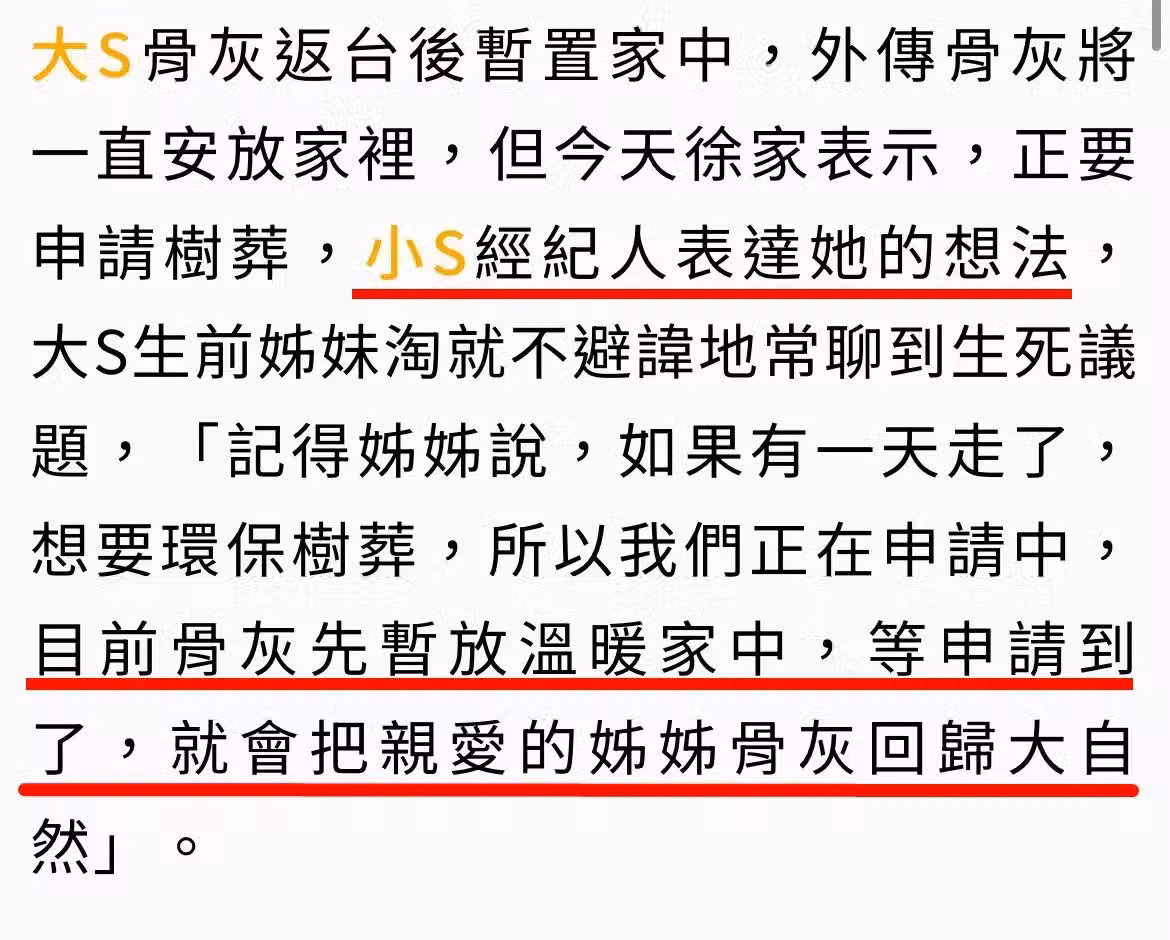 不過,消息曝光後,遭到豪宅鄰居的抗議,小S方面正式闢謠,表示已為姐姐申請樹葬,同時透露這是大S遺願。