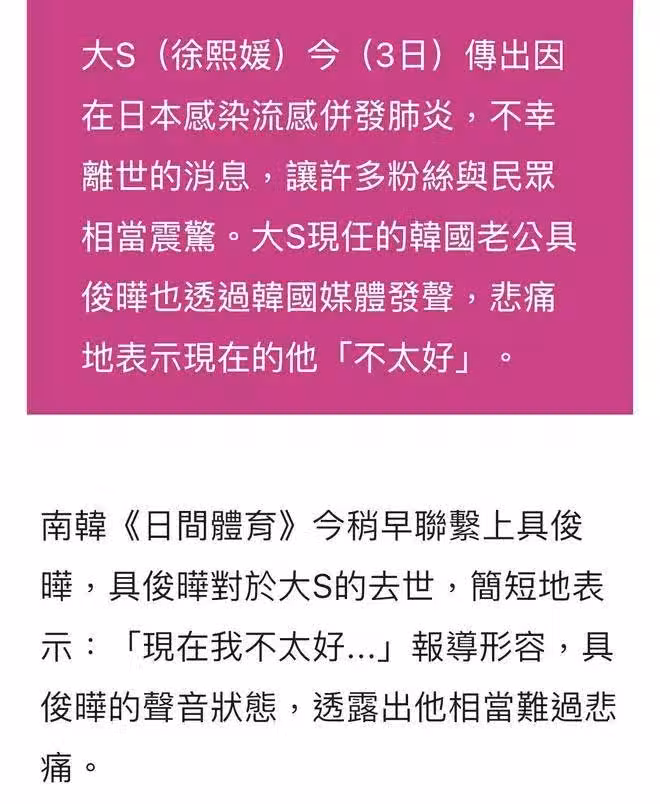 大S是在日本感染了流感引發了肺炎最終不治離世,大S患病的時候具俊曄也在身邊相伴,所以他也是陪伴妻子到最後的人士。全家人應該都沒預料到只是一個流感竟然就這麼要了大S的命,其中應該還是有所疏忽吧,這對於具俊曄來說,真是會有愧疚感甚至悔恨感吧,所以在大S離世之後,他一度失聯,如今表態「現在我不太好」,可想而知他是多麼地難過與悲痛。