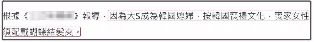 有台媒報道,因為大S是韓國媳婦,按照韓國喪禮文化,喪家女性需要佩戴蝴蝶結髮卡,小S這麼做也是對姐夫的一種認可和尊重。