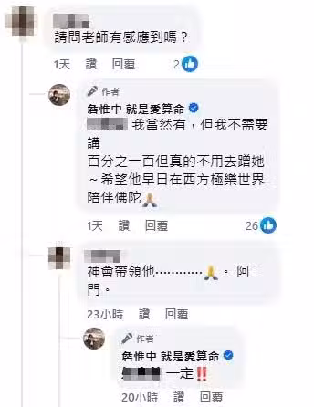 也有網友好奇詢問:「是否有感應到什麼訊息?」,詹惟中坦承,確實有所感應,但他選擇不多加描述,只回應「百分之一百,但真的不用去蹭她。」,並祈願大S能早日在西方極樂世界與佛陀相伴。