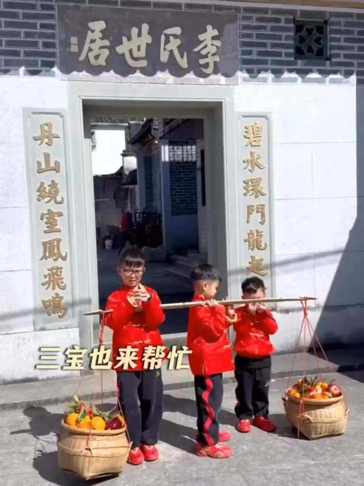 胡杏兒春節帶三個兒子回祠堂祭祖,化身客家媳婦,挑扁擔很接地氣