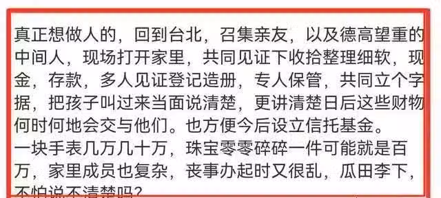 大S有沒有留遺囑,遺產到底怎麼分配?作為最親的姐妹,小S責無旁貸,應該請來家族德高望重的長輩,在眾人見證下,清點大S的存款和首飾,並且登記造冊。