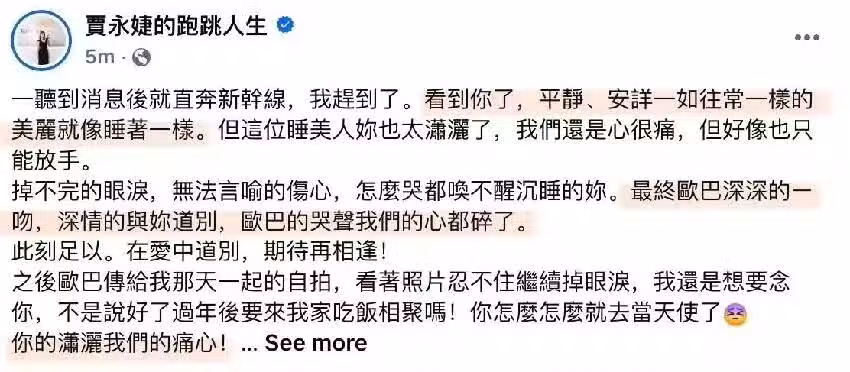 第一次是大S去世後,賈永婕曝光了大S的臨終畫面,就是她向外界透露,大S離世後,具俊曄對大S深情一吻,做最後的告別。
