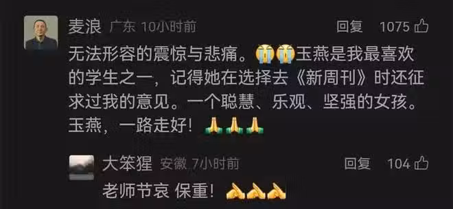 她說她「做事認真但從不發火,永遠平和善良,永遠純樸踏實。校對很苦很枯燥,我們聊生活聊工作,但她從不抱怨,偶爾才在只言詞組中提到新的一期內容要出來,她要去加班通宵校對了......難以接受,心中滿是不舍。」