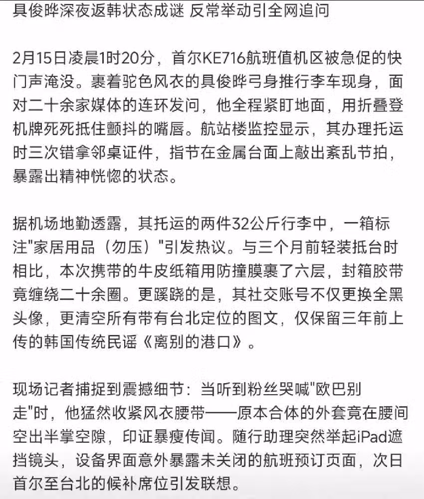 據媒體透露現場的情況,當時具俊曄臉色非常憔悴,身形也消瘦了許多,和之前賈永婕爆料的具俊曄瘦了12斤剛好對上了。具俊曄也沒想到機場會有二十多家媒體的蹲守,看到媒體拍自己,他就低著頭全程一言不發,但媒體卻發現具俊曄的狀態非常不對勁,不知道是不是傷心過度的原因,他的嘴唇發白,且一直顫抖,期間還用登機牌擋住自己的嘴唇。