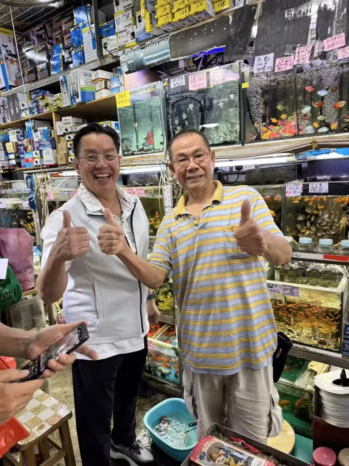 74歲譚詠麟到街邊小店,買了幾條金魚,不擺架子,和店主友好交談