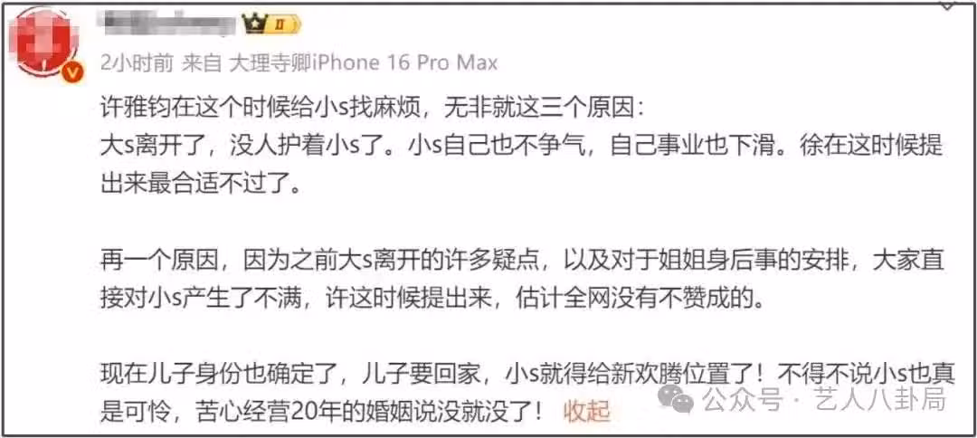 許雅鈞趁亂讓私生子上位,台媒稱小S終日以淚洗面,失去大S撐腰,淒悽慘慘