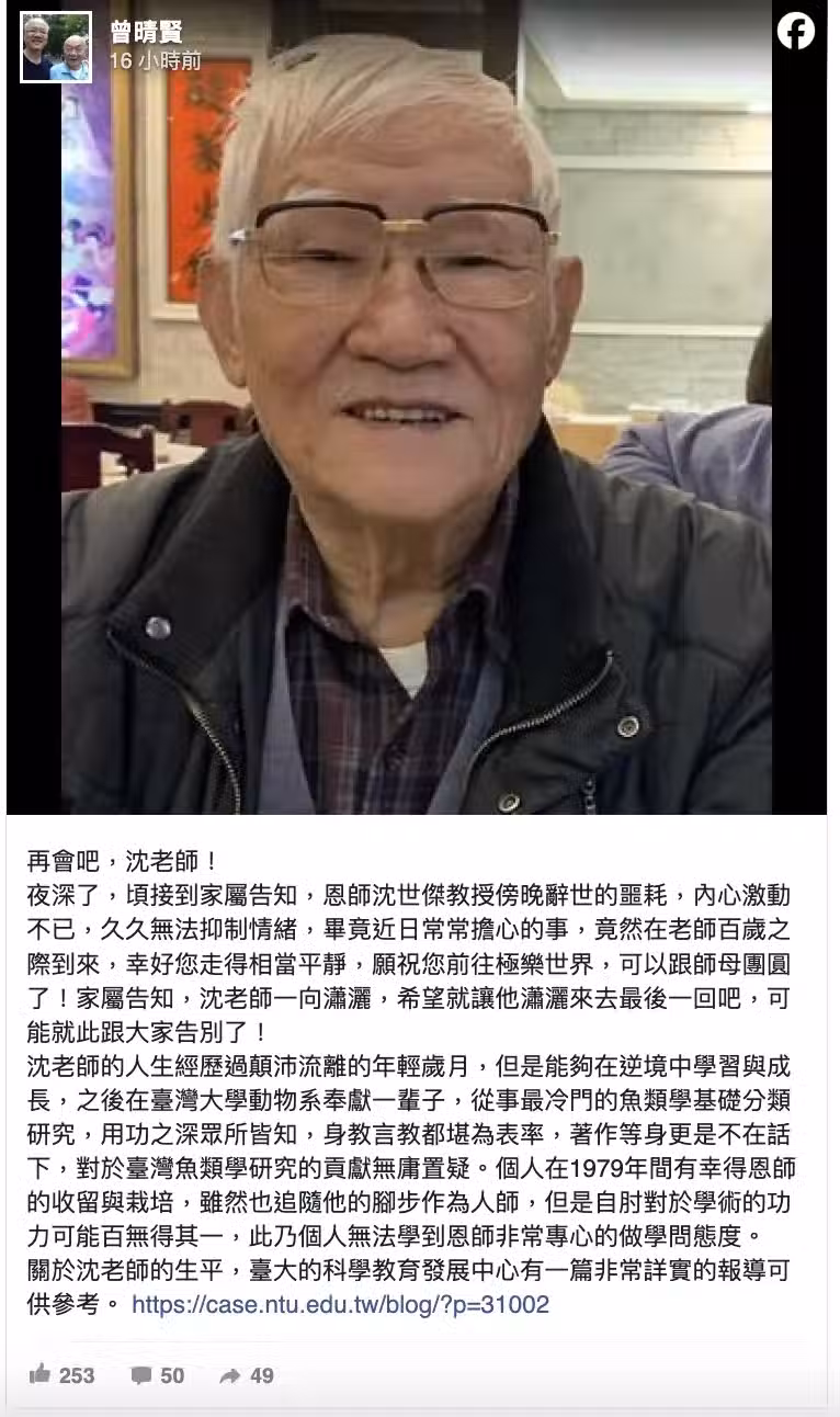 沈世傑教授1926年出生於山東,被視為繼陳兼善之後,台灣魚類研究的集大成者。