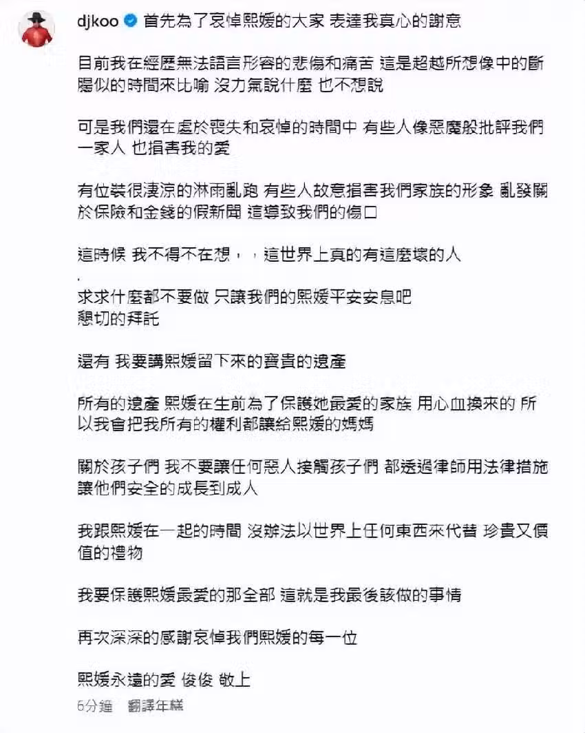 到了2月6日晚,具俊曄首次發布長文悼念大S。