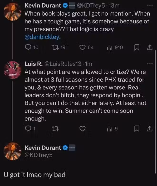 杜蘭特這次無言以對,只能回覆:「你懂了,哈哈,是我的錯。」過了一會兒,杜蘭特把對線的回覆都刪了。能讓杜蘭特破防的網友不多,這哥們做到了。太陽戰績確實一年不如一年,杜蘭特很難反駁,而且連噴人的技能也被網友嘲諷!