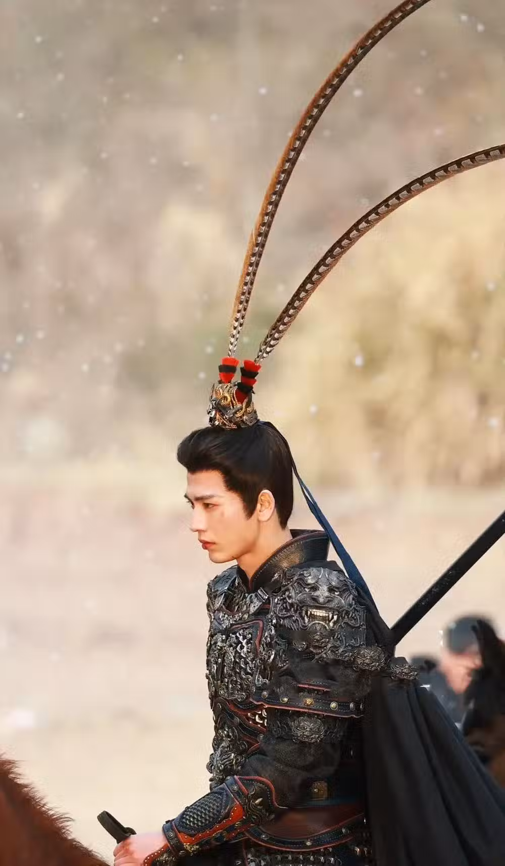而在另一個畫面里,張凌赫同樣是同款戰甲,只不過是沒有了發冠。自身對於角色有著超高駕馭度的同時,與身著紅色戰甲、騎著戰馬的女主田曦薇同框時,兩人超高的CP感真的是讓人不由得驚呼:太般配了!