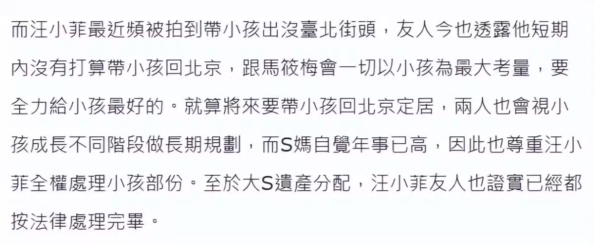 大S媽媽年事已高,尊重汪小菲全權處理小孩部分,她曾在2月28日受訪表示放棄遺產爭奪,喊話汪小菲好好帶大兩個子女,情緒悲痛,希望外界不要空穴來風,讓她睜開眼就流淚。