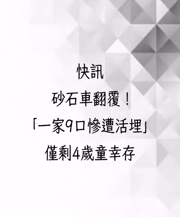 快訊/砂石車翻覆!「一家9口慘遭活埋」僅剩4歲童倖存……