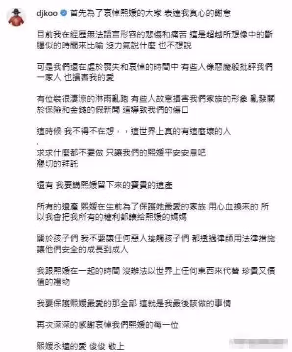 接著針對大S的遺產繼承流言,發聲明說把支配權交給徐媽媽。