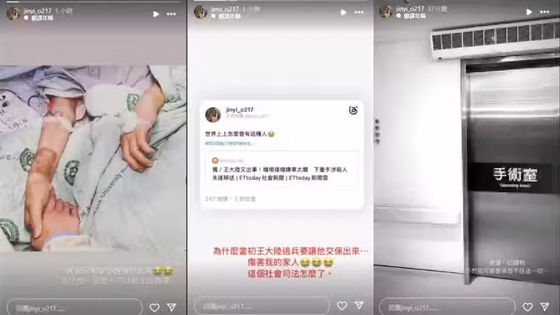 而該女網友被指是假帳號後,仍持續在社群平台「Instagram」上發文,曬出「爸爸躺病床插管照」哭訴:「爸 我只希望你趕緊好起來 為什麼一個藝人可以做出這種事…」、「為什麼當初王大陸逃兵要讓他交保出來…傷害我的家人(哭)(哭)(哭)這個社會司法怎麼了」。此外,她還貼出手術室外的黑白照,淚喊:「希望一切順利 不然我可能會承受不住這一切…」。