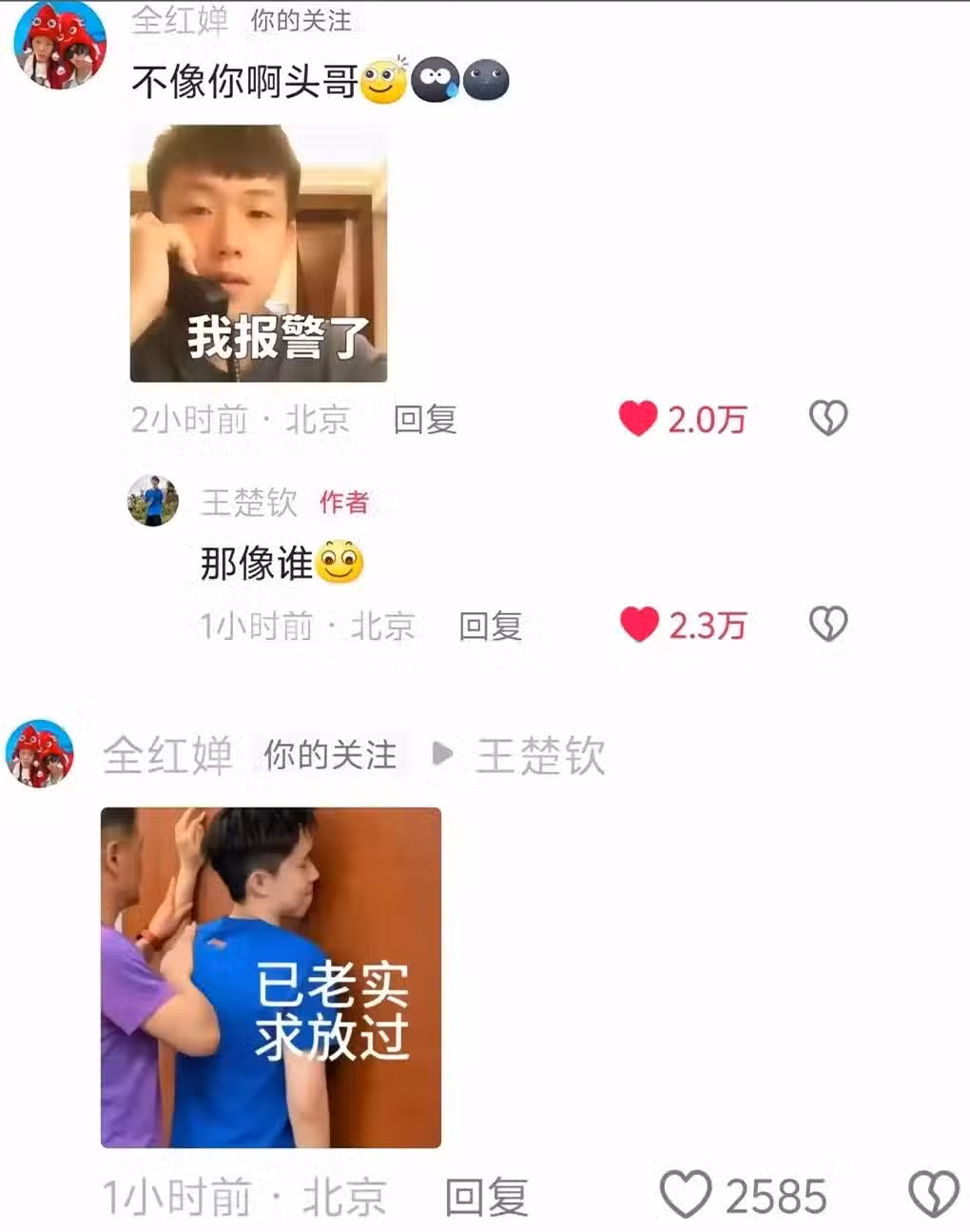 每次王楚欽有新動態,全妹基本上都是光速來玩梗,動不動就把頭哥掛網上,全網估計也只有全紅嬋膽子最大,敢當面蛐蛐大頭的,大頭對這個搞怪的妹妹也是團寵,誰叫你是妹呢。