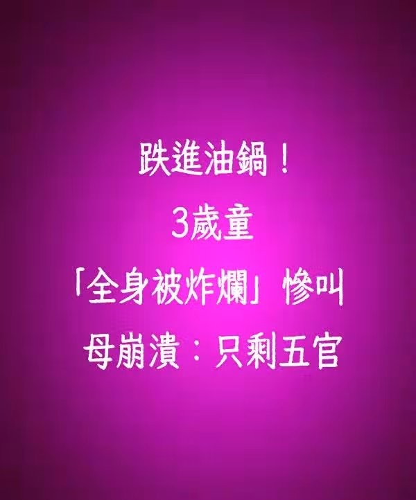 中國一名3歲男童和小朋友追逐打鬧,結果不慎跌進滾燙油鍋,男童送醫後全身65%的面積燒傷,媽媽看了崩潰喊「就像被剝了皮的羔羊一樣」。