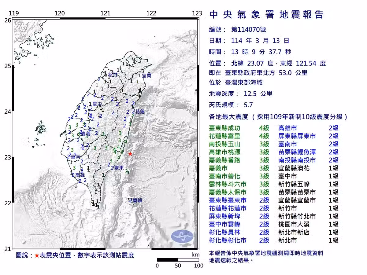根據中央氣象署報告顯示,下午1時9分,位於台灣東部海域,即在台東縣政府東北方53.0公里,深度12.5公里,發生規模5.7地震,本起地震預估達災防告警系統發送門檻,告警範圍包括台東縣、花蓮縣。