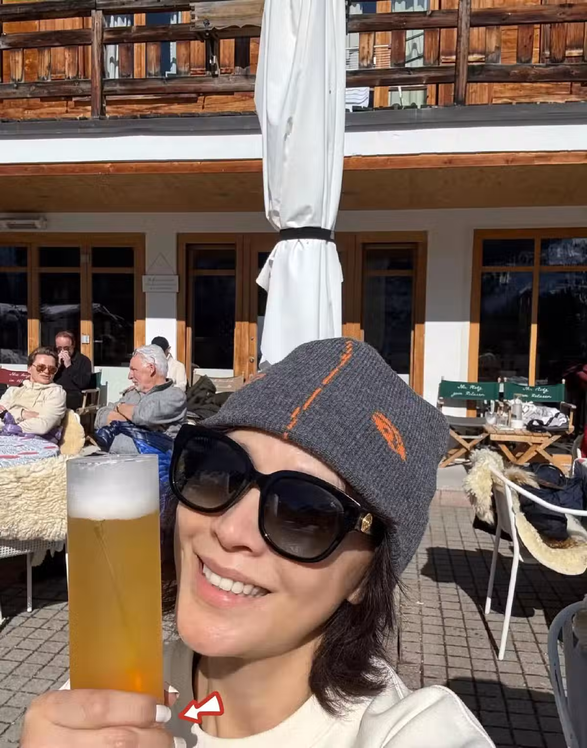 在雪山腳下的劉嘉玲真的好愜意,喝著啤酒,吃著披薩,陽光溫暖又和煦,難掩生活美好的美麗心情。