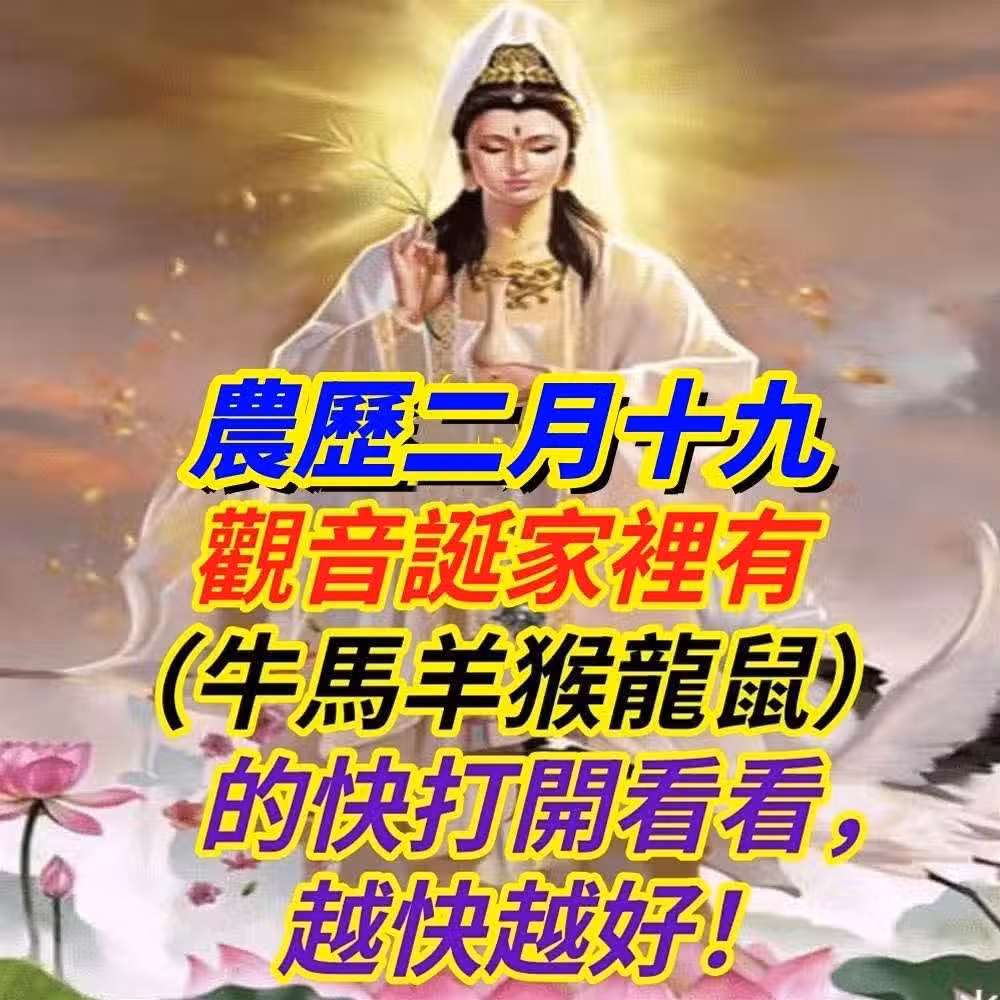 農曆二月十九【觀音誕】家裡有(牛馬羊猴龍鼠)的快打開看看,越快越好!