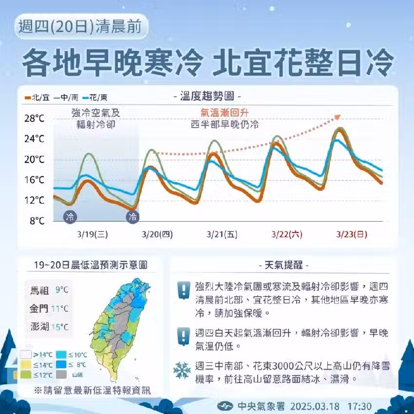 但吳德榮根據最新各國模式模擬顯示,發現下周四 (27) 或周五 (28) 又會有一波鋒面南下,且一波冷空氣隨後也跟著報到,預計是3月最後一波寒冷。