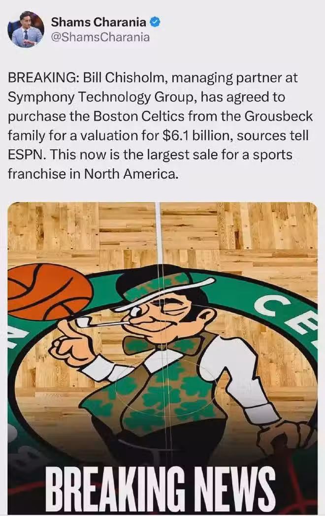 Shams:交響樂科技集團執行合伙人比爾-奇澤姆,同意以61億美元價格,從格羅斯貝克家族手中收購凱爾特人。
