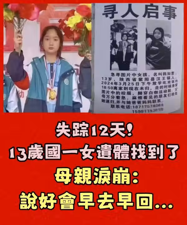 失蹤12天!13歲國一女「遺.體找到了」狀況曝光 母親淚崩:說好會早去早回...