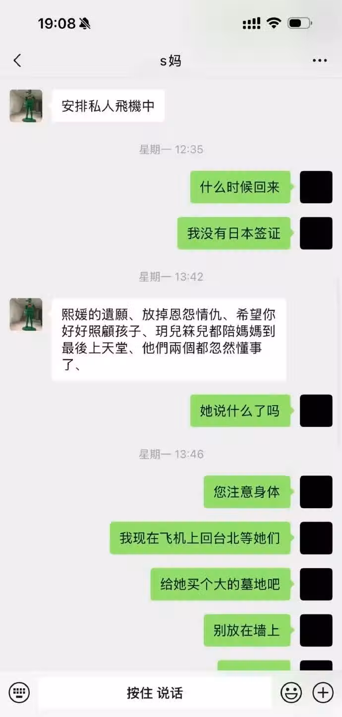 聊天記錄之中媽說:「熙媛的遺願,放掉恩怨情仇,希望你好好照顧孩子,兩孩子都陪媽媽到最後上天堂,他們兩個都忽然懂事了。」
