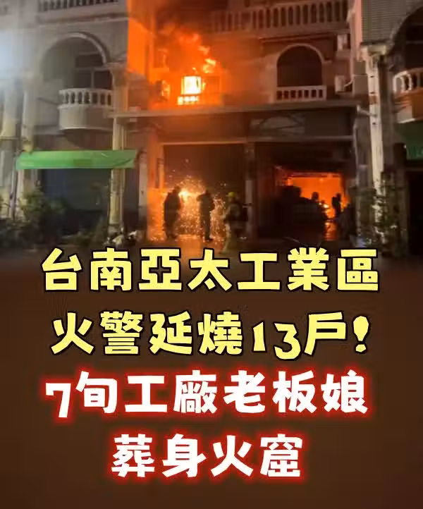 台南永康亞太工業區,22日凌晨發生火警,火勢延燒迅速、總共延燒13戶,現場都是百坪左右的住商混合工廠,其中一戶塑膠工廠,76歲老闆娘住在2樓,逃生不及,不幸罹難,鄰近住家的鴿舍,上百隻鴿子也葬身火窟。