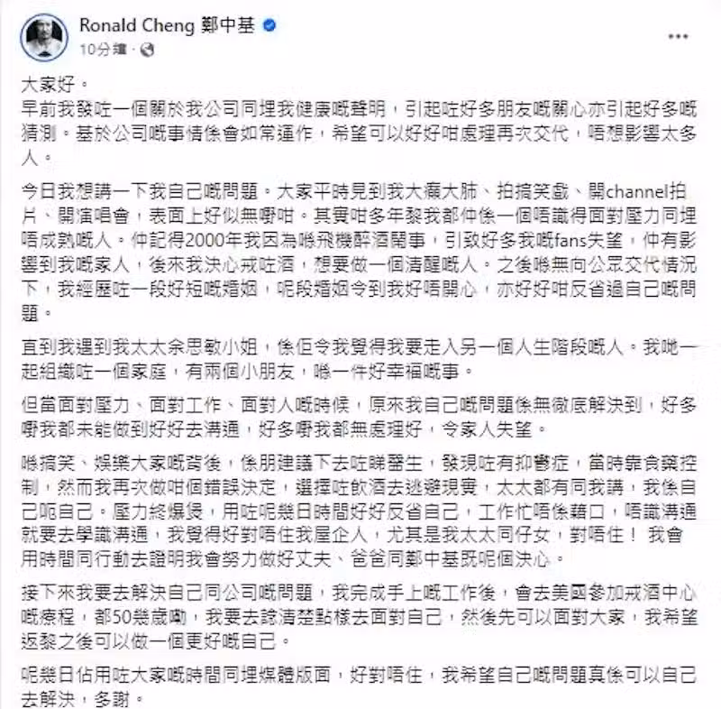 此前,鄭中基宣布停工,在太太的陪伴下,飛到美國進行戒酒療程。